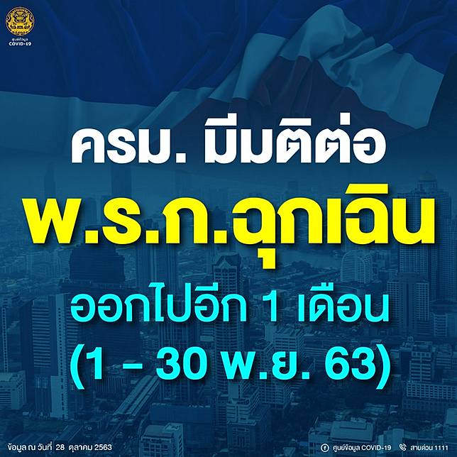 2563 เป็นตันไป จนกว่าจะมีการเปลี่ยนแปลง ประกาศ ณ วันที่ 10 เมษายน พศ2563 เป็นต้นไป พรก.ฉุกเฉิน. ศบค.เคาะต่อ พรก.ฉุกเฉิน อีก 1 เดือน ยาวถึงสิ้นเดือนตุลาคม 2563 22 กรกฎาคม 2563 ศบค.ต่อ พรก.ฉุกเฉิน อีก 1 เดือนถึง31 ส.ค.63